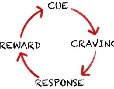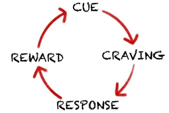 This is a loop our mind makes us go through in seconds hundereds of time everyday, we first see something which acts as the cue, then a craving kicks is which makes us want to take action / react, then we respond by taking the action and get rewarded by the fulfillment of our action